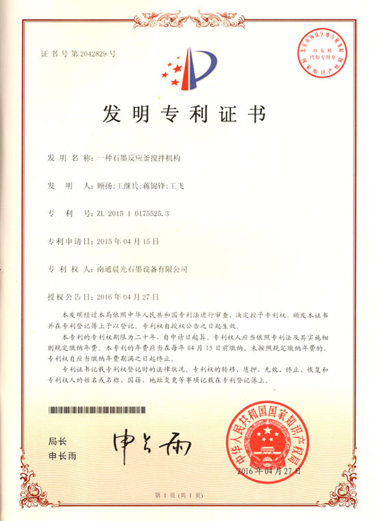 發(fā)明專利 :一種石墨反應(yīng)釜的攪拌機(jī)構(gòu) 專利號:ZL 2015 1 0175525.3