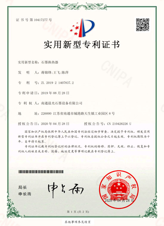實用新型專利 :石墨換熱器 專利號:ZL 2019 2 1407837.2
